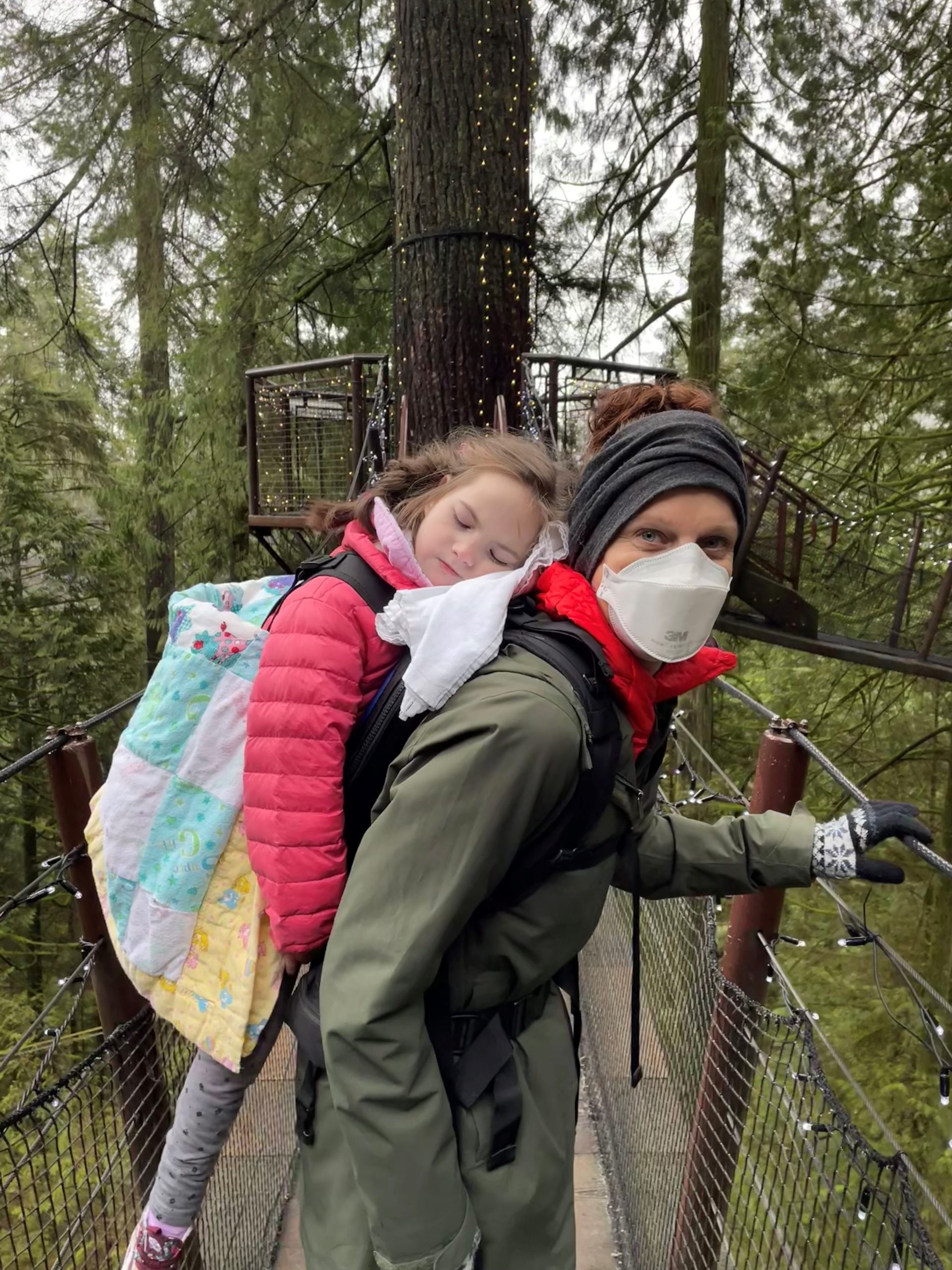 Equipment failure is one thing, inaccessibility and misinformation are actually the greater barriers. One of our favorite things is advocacy and showing others that EVERY activity can be made accessible—you just need the problem solving skills and willingness of the participants. When folks tell us that “it’s not possible for a child who uses a wheelchair to do something”—that’s when we dig in our heels and double down. If you have a look at the picture of Katie on my back—we’re up about 75 feet in the treetop canopy in the Capilano Suspension Bridge park on the North Shore. Maybe Katie’s wheelchair wasn’t going to go up there but Katie sure as heck was! We took another, much bigger child, to that same park a few weeks later and used a completely different transportation device to make sure he could see all the sites too.
